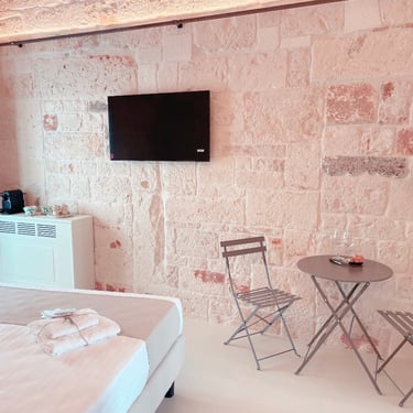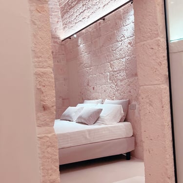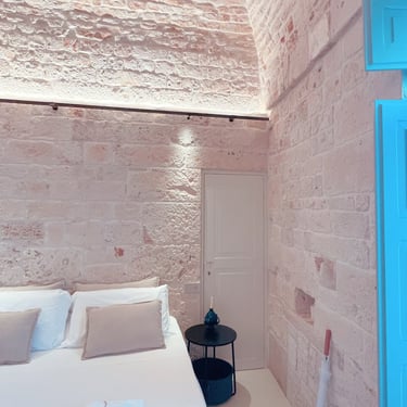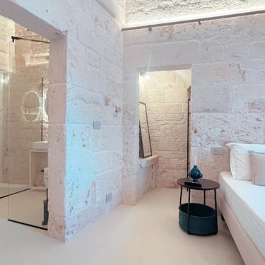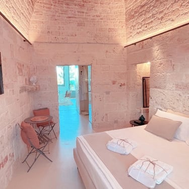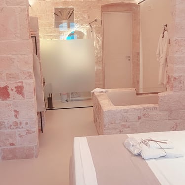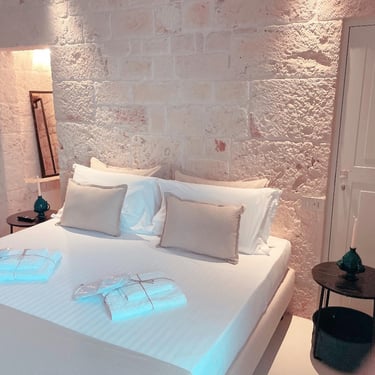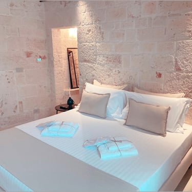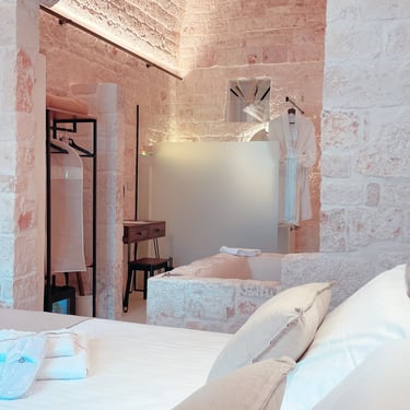 King Room - Il Chiostro dei Medici 103 (Garden in the Center) The Junior Suite 103 is located in a historic dwelling called "Cummerse", a typical house with a sloping roof ("cum vertex") dating back to 1300 AD, a period that precedes even at the birth of the Trulli. With a size of 20m2, it is divided into a sleeping area dominated by a King Size bed, a small and comfortable walk-in closet, and an area equipped with a large bathroom with a fixed shower in the stone, where once there was an old manger rediscovered with the processes of the past.